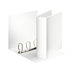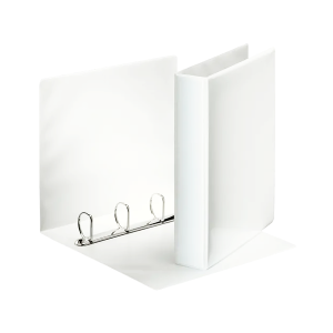 Carpeta de color blanco con bolsillos transparentes en tapa frontal y lomo para personalizar, en tamaño A4 con 4 anillas mixtas de 25 mm. Capacidad para 230 hojas. Certificado FSC. Medidas 319x260x44 mm