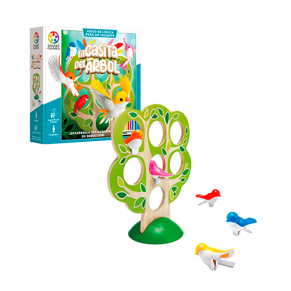 Descubre dónde se posan los pájaros al llegar a su árbol. Utiliza las pistas de los 60 desafíos para colocar correctamente a cada pájaro en su lugar en el árbol de madera.