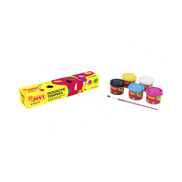 Témpera JOVI opaca de colores vivos. Estuche de 5 botes de 35 ml. Se utiliza con pinceles, rodillos, espátulas, etc. Se aplica sobre superficies de papel, cartulina, arcilla, madera. etc.